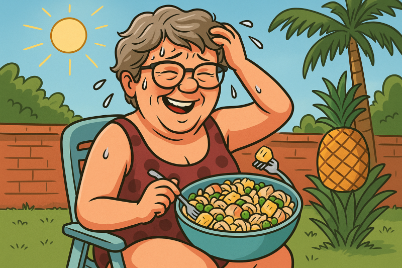 - Meng alles in een grote kom: pasta, kip, groenten, ananas, doperwten en dressing. Schep goed om.
