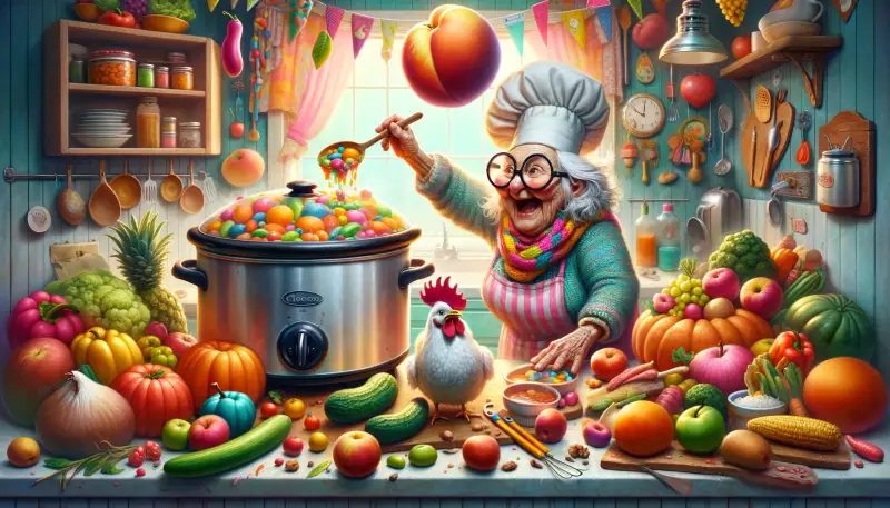 • In een middelgrote kom, combineer de tomatenblokjes, sambal oelek, sojasaus, bruine suiker, gemberpoeder, komijnpoeder, korianderpoeder, zout, en peper. Giet dit mengsel over de kip en groenten in de crockpot
